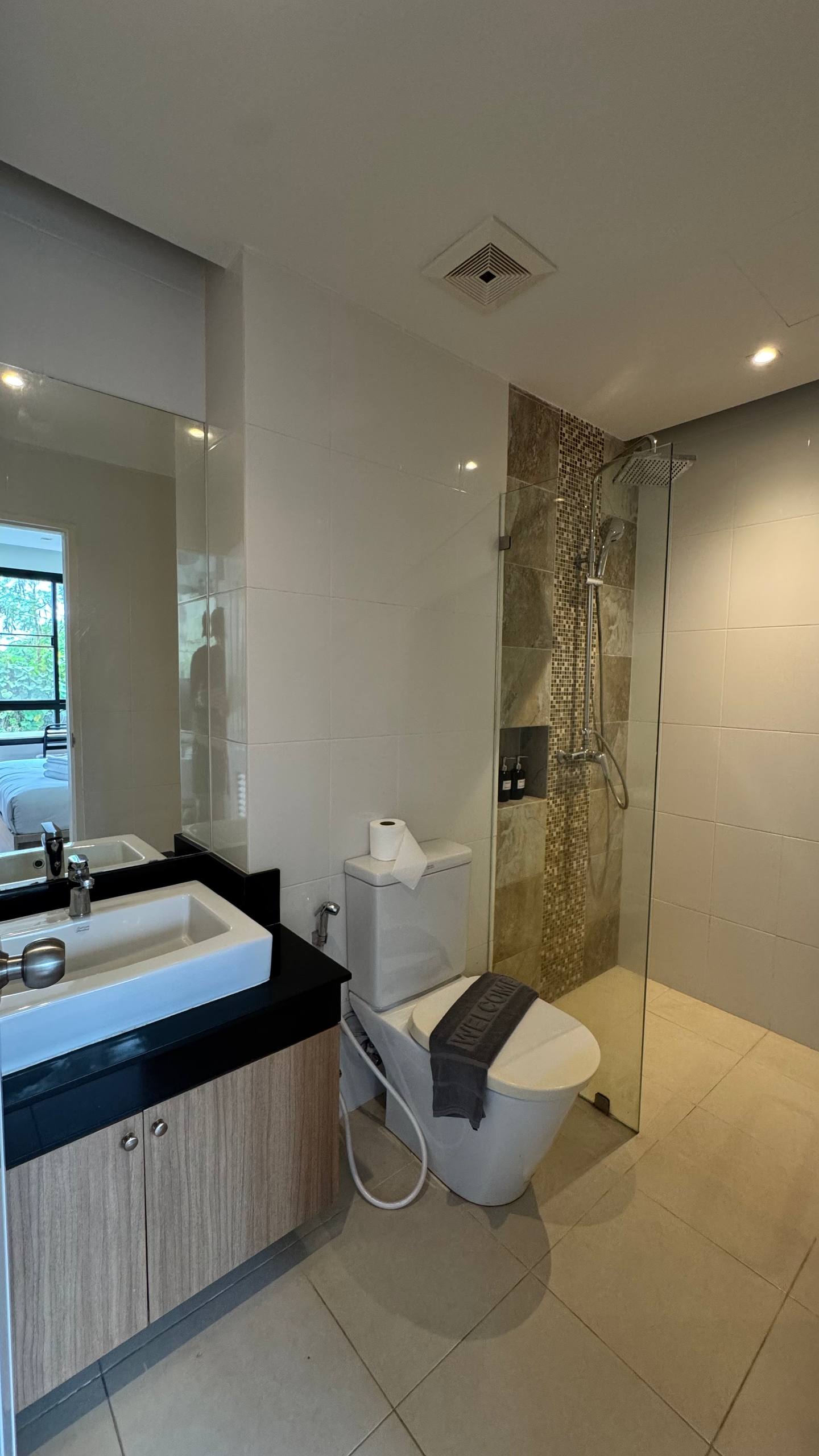 Отдельная спальня: большая кровать, шкаф, рабочее место, кондиционер, смарт-тв;