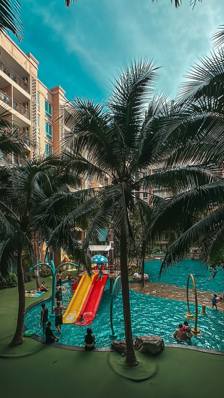 На территории большой бассейн с джакузи и водными горками, детский бассейн, тренажерный зал, круглосуточный магазин 7/11, кафе, массажный салон, парковка и охрана 24 часа.