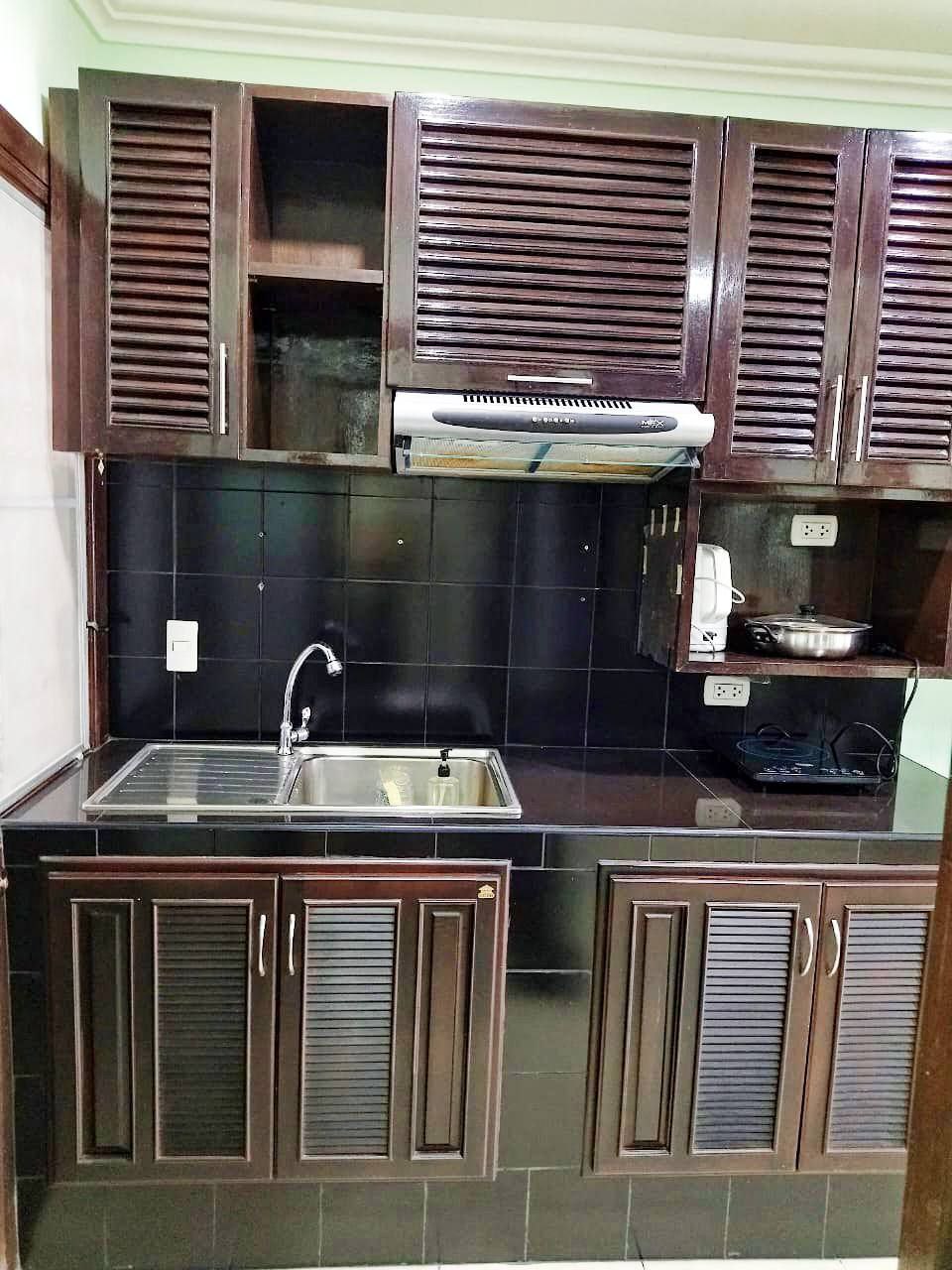 Кухонный уголок с вытяжкой, индукционной плитой, аэрогрилем, микроволновкой и всей необходимой посудой.