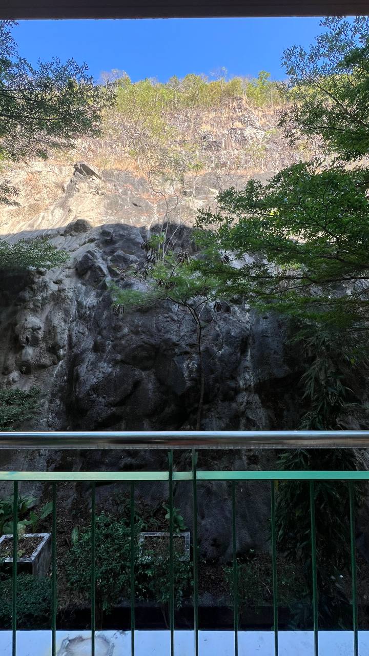 Очень тихо, вид на гору, когда дожди у вас собственный водопад очень красиво, птицы поют, бабочки летают)