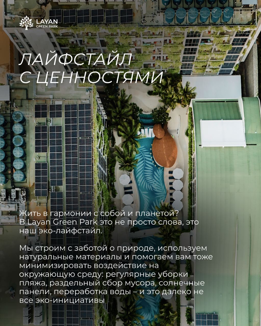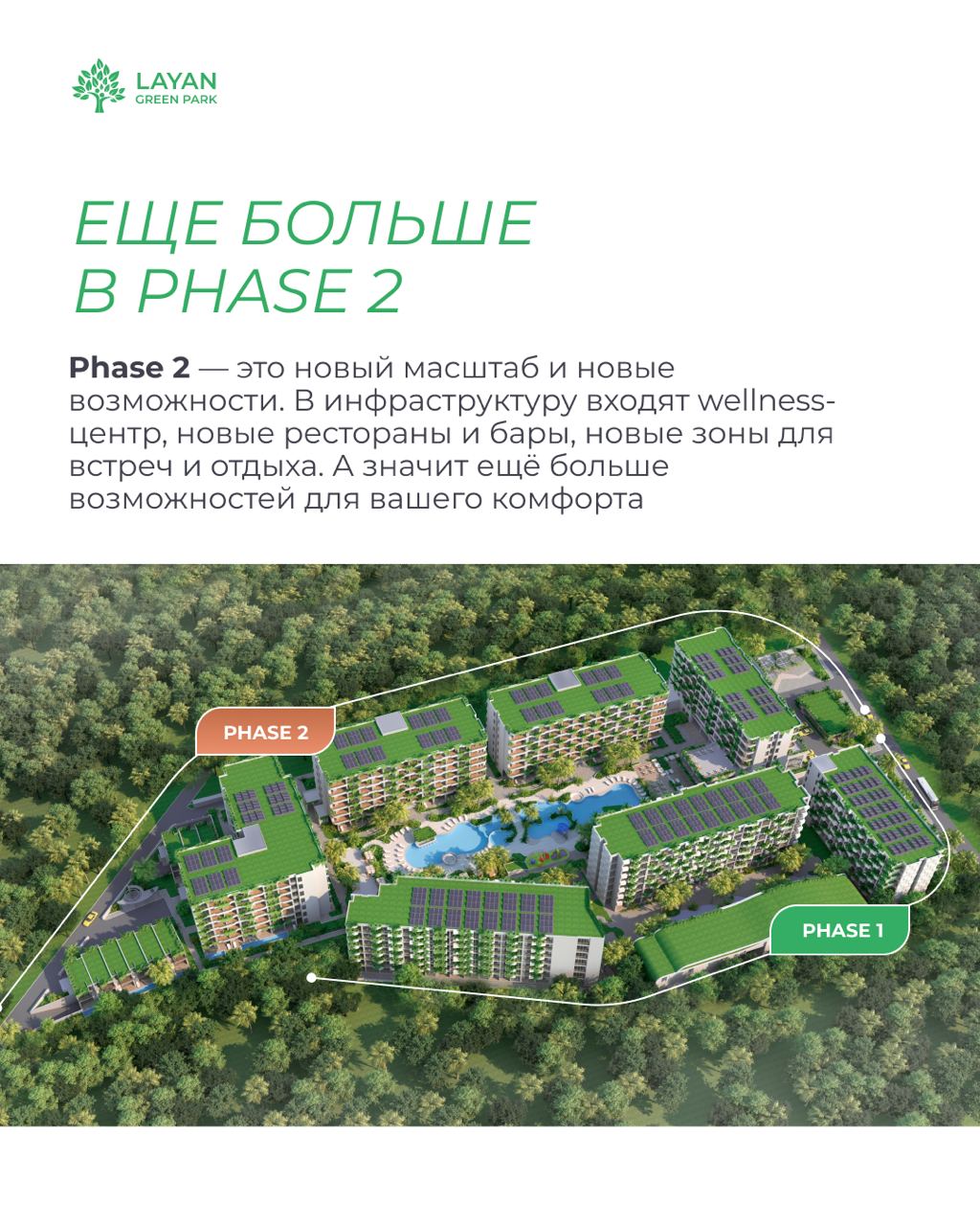 В нашей карусели мы собрали 8 ключевых элементов инфраструктуры, которые не просто дополняют ваш отдых, а формируют тот самый уникальный эко-лайфстайл Layan Green Park. От утреннего кофе с видом на пальмы до закатов на Лаяне – листайте и вдохновляйтесь! Уверены, вам захочется оказаться здесь прямо сейчас.