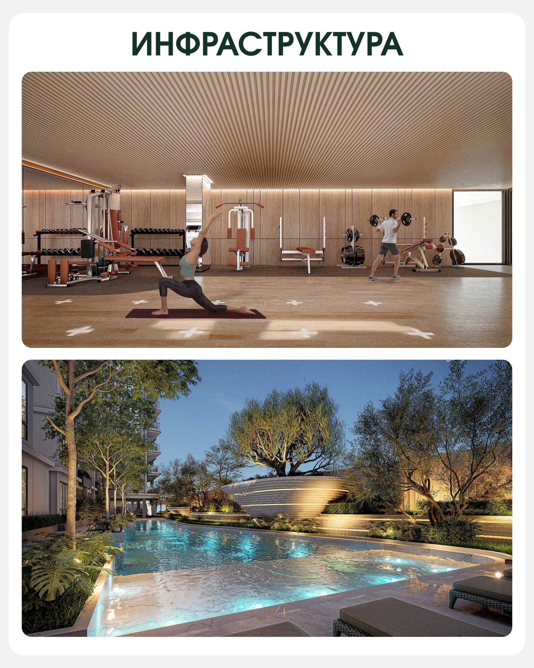 Инфраструктура: бассейн; сауна, фитнес-зал; роскошное лобби; охрана 24/7 и парковка