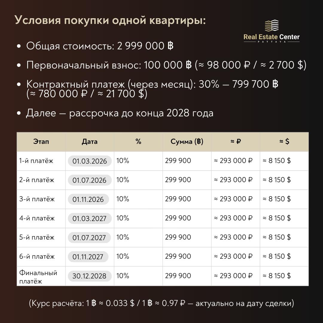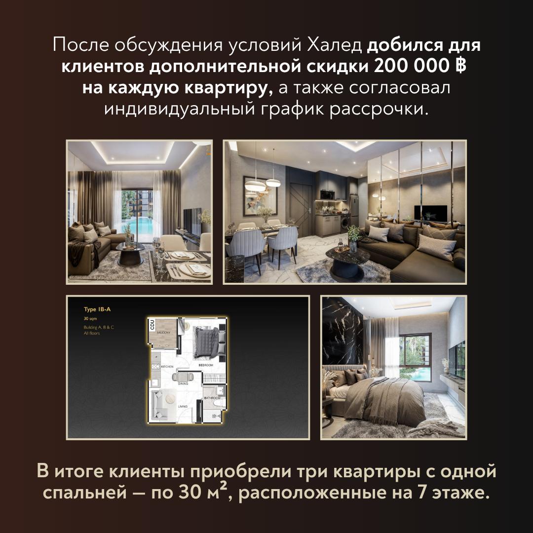 ️ После обсуждения условий Халед добился для клиентов дополнительной скидки 200 000 ฿ на каждую квартиру, а также согласовал индивидуальный график рассрочки.