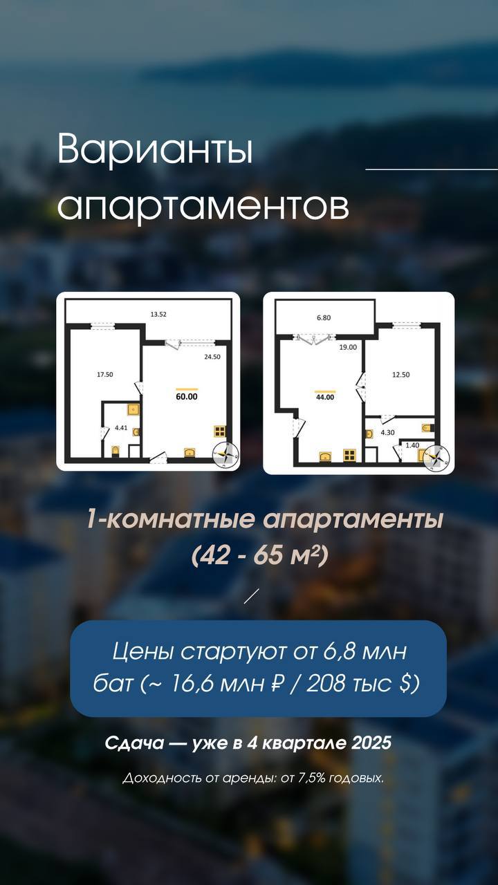 ️ 1-комнатные апартаменты(42-65 м²)– от 6,8 млн бат(~ 16,6 млн ₽ / 208 тыс $)