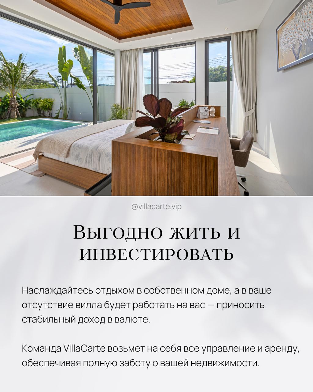 Наслаждайтесь отдыхом в собственном доме, а в ваше отсутствие вилла будет работать на вас — приносить стабильный доход в валюте.