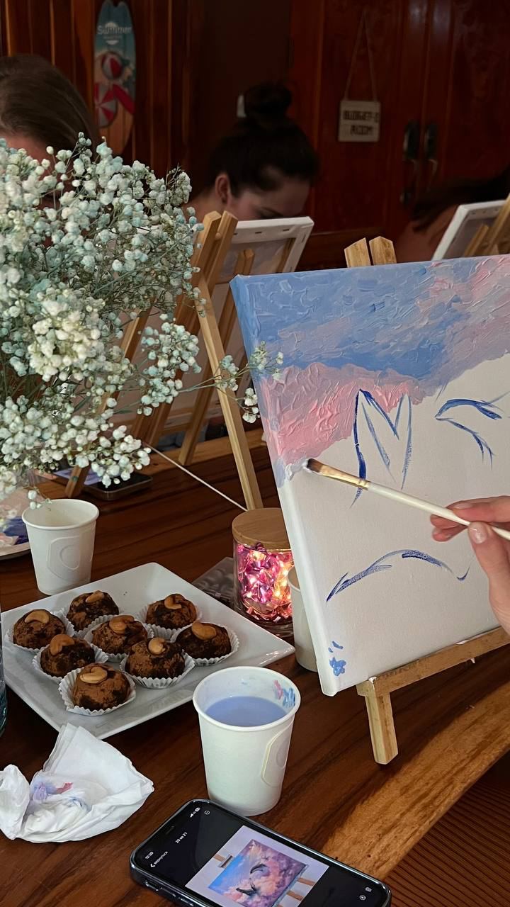 Профессиональная художница приедет к вам с полным набором материалов: холсты, краски, кисти – всё, чтобы создать свой собственный шедевр. Вы сможете нарисовать любую картину в любом стиле!