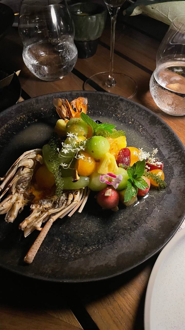 Например, я брала салат из речной креветки с фруктами и необычным рыбным соусом. Подача восторгает, а вкус достаточно необычен из-за соуса.