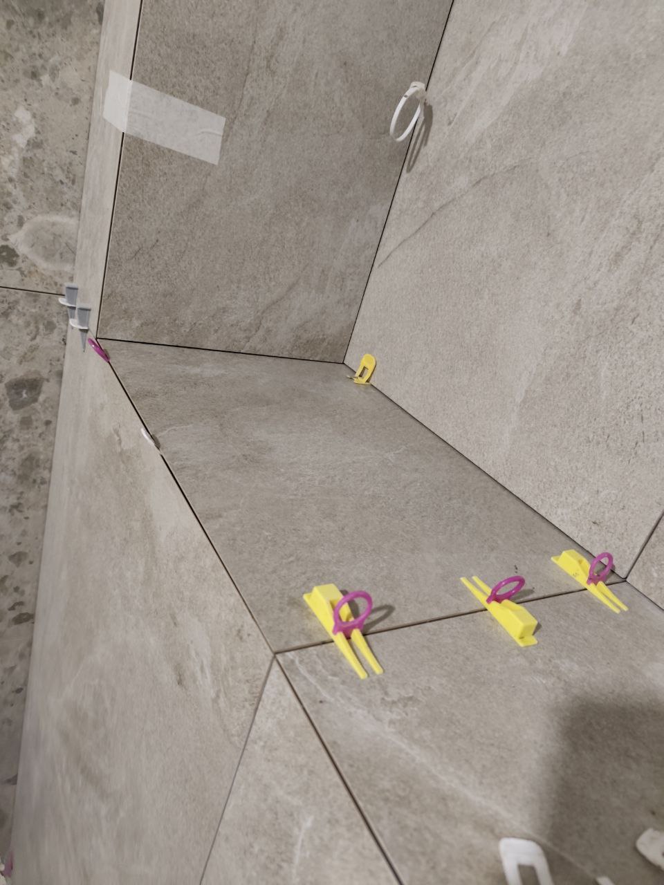 плитка хоть и Laparet, качественная, но в плоскости все равно идёт дугой. Чтобы запил 45 градусов и именно шев, можно было контролировать( сжимать если нужно ), две стороны плитки нужно клеить одновременно.