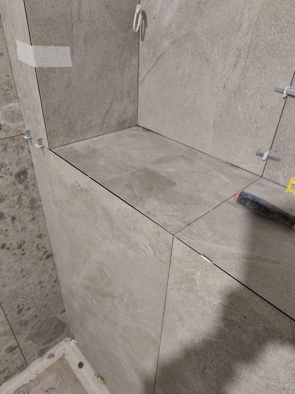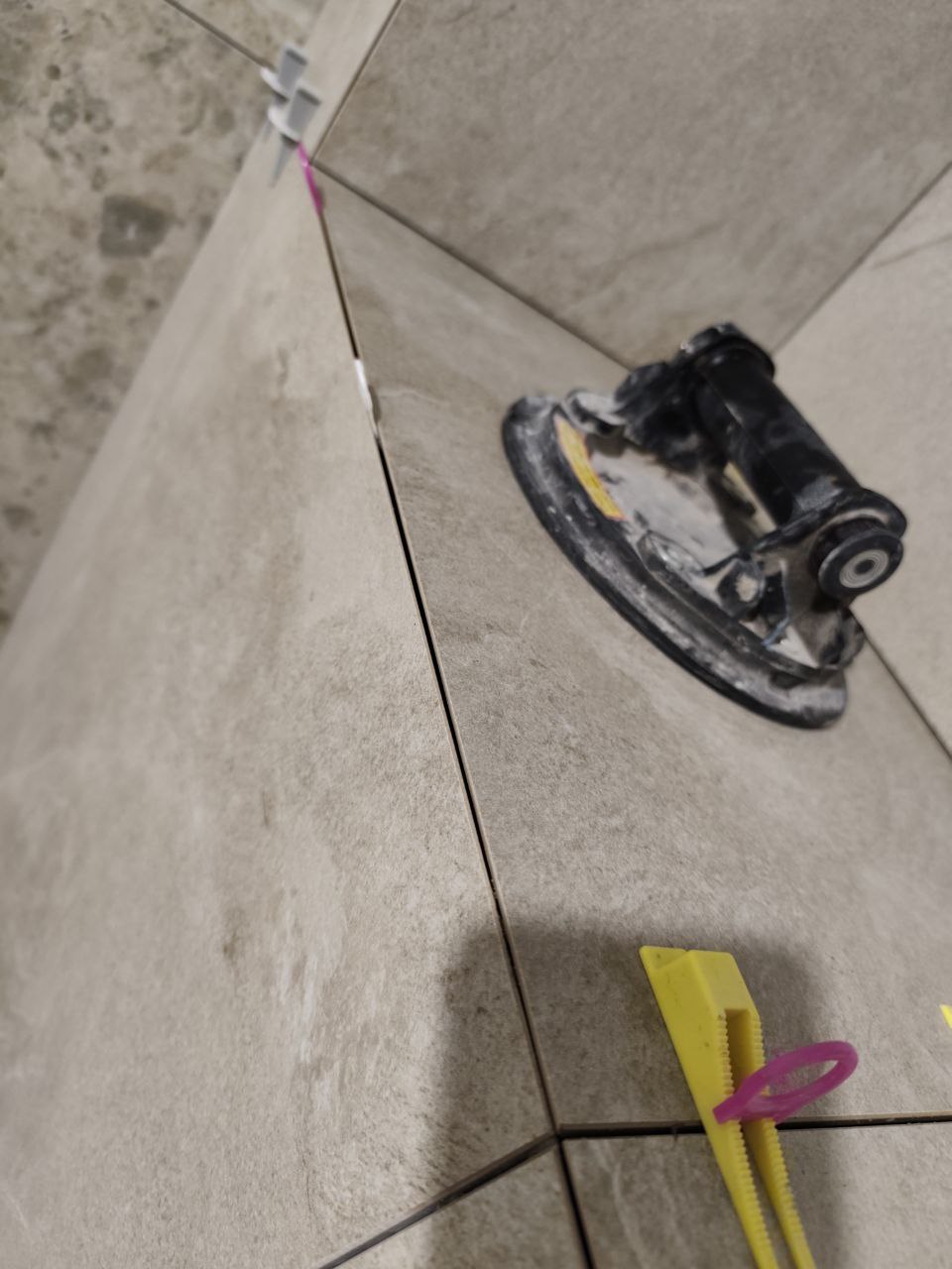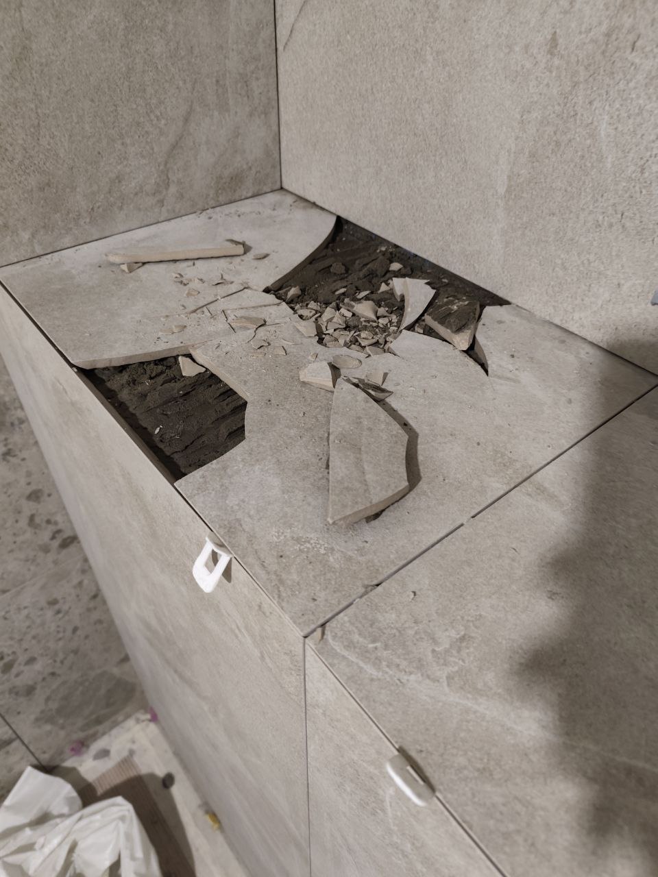 А я сперва запилил и приклеил плитку на инсталляцию и начал заниматься дальше другими делами. Естественно, когда начал прикладывать к ней вторую часть, она уже высохла и не сжимается. А так как плоскость дугой, получился большой шев.