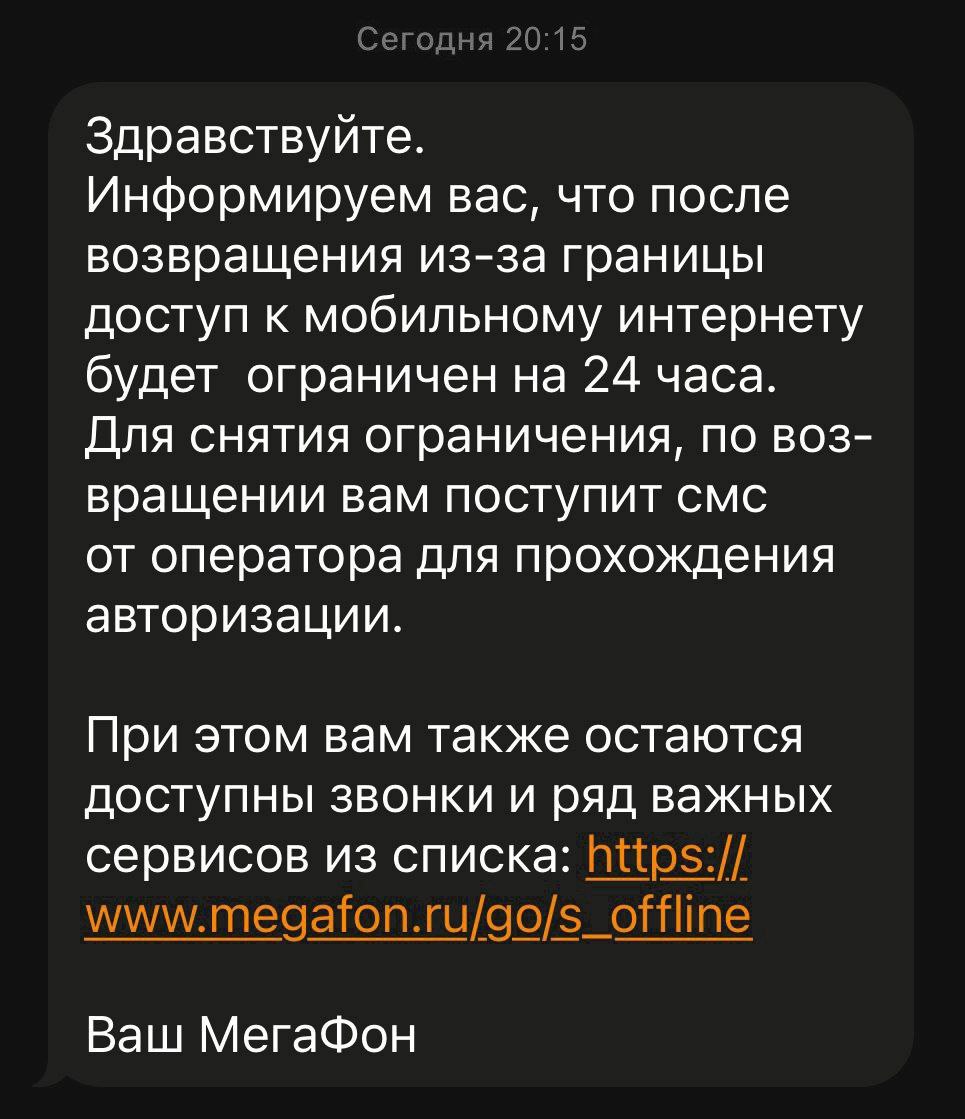 «В соответствии с требованиями безопасности после возвращения в Россию по вашему номеру будут временно ограничены мобильный интернет и СМС. Для восстановления доступа нужно пройти верификацию»
