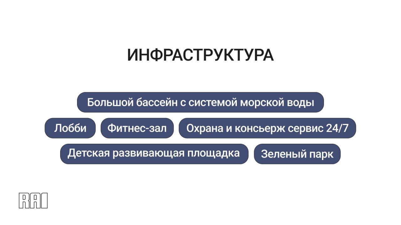 Наполнение комплекса: большой бассейн с системой морской воды, фитнес-зал, зеленый парк, лобби, детская развивающая площадка, охрана и консьерж-сервис 24/7